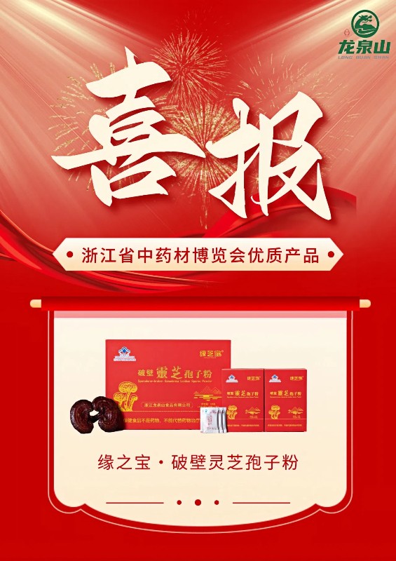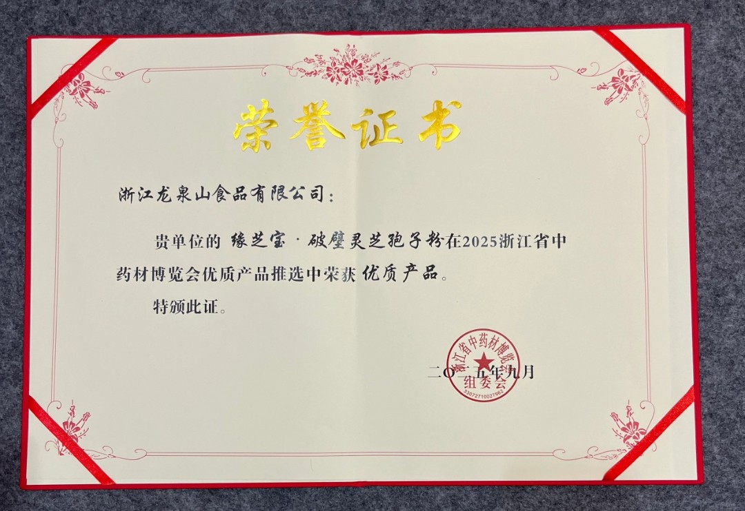 捷报飞传,荣誉再临!继去年在浙江省中药材博览会上大放异彩后,我公司——浙江龙泉山食品有限公司,在今年举办的博览会上再度凭借卓越的产品品质与创新实力,赢得评委会的高度认可。我们荣幸地宣布,公司旗下产品 “龙祖山·黑金灵芝茶珍固体饮料” 荣获 “优质产品金奖” ,经典产品 “缘芝宝·破壁灵芝孢子粉” 荣获 “优质产品” 。此番连获两大奖项,是行业与市场对我们持续深耕灵芝领域、追求产品卓越的又一次有力肯定。